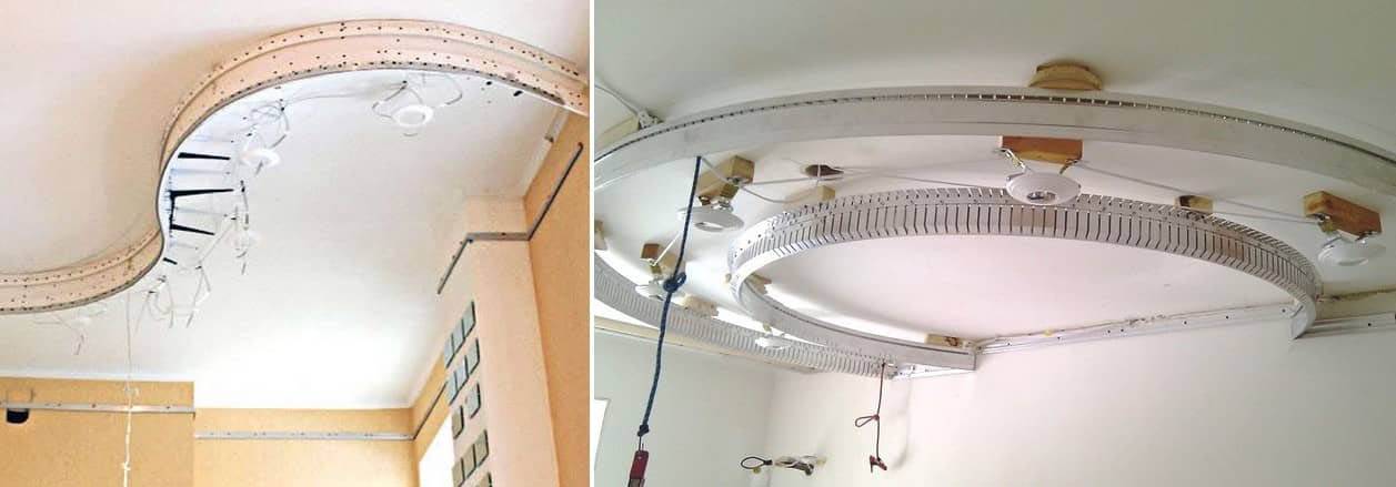 Второй вариант менее затратный финансово и по времени. Дополнительно к профилю по линии фиксирования багетов, согласно разметке, повторяющей узор потолка, необходимо закрепить деревянные бруски. При создании криволинейных форм применяется специальный профиль с надрезами. Для установки двухуровневых потолков рекомендуется только металлический профиль.