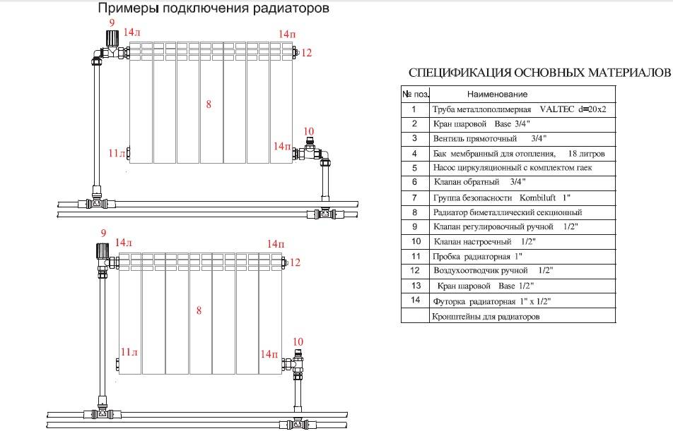Магистраль подсоединяется к радиаторам одно- или двухтрубным способом, сбоку или снизу.