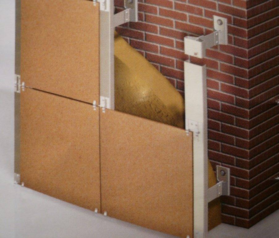 Необходимо чтобы после монтажа каркасных профилей и облицовочных плит, между стеной и теплоизоляцией остался вентиляционный зазор в 3-5 см.