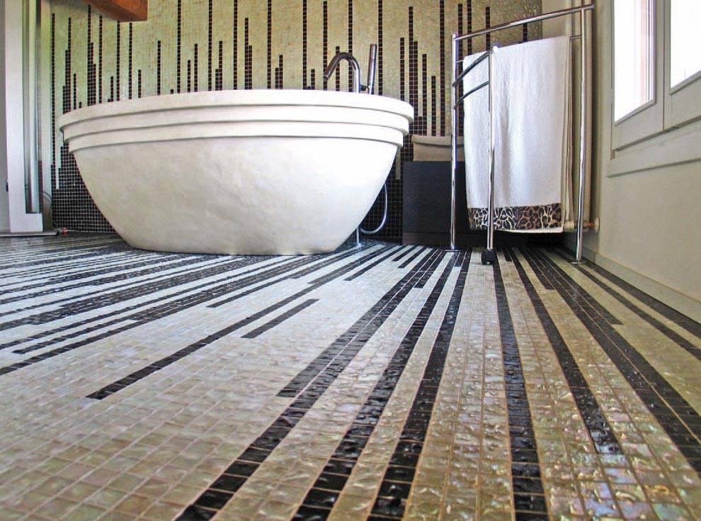 - мозаика на полу в ванной должна укладываться на идеально ровную поверхность, которая может быть выполнена из бетона, металла, дерева;