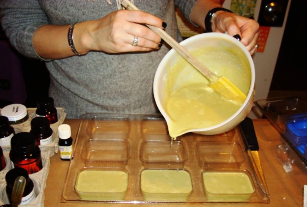 Смешайте масла и щелочь одинаковой температуры (не более 37°С). Выливайте щелочь в масла. Работайте аккуратно, если щелочь попала на кожу, нейтрализуйте ее уксусом.