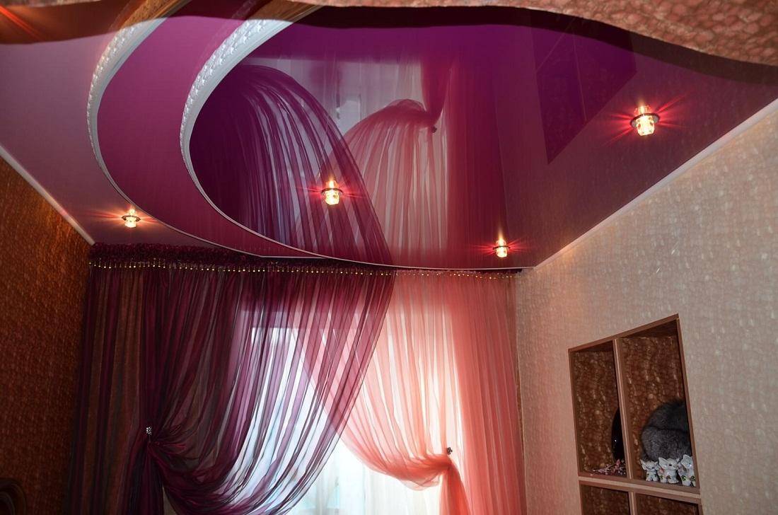 - Многообразие цветов и типов поверхности потолков (матовая, сатин, глянец, зеркало и т.п.), что дает возможность реализовывать самые смелые дизайнерские решения, к примеру, создавать своды, шатры, арки, многоярусные потолки, потолки с печатными изображениями и т.п. Кроме того, конструкция натяжных потолков позволяет скрыть технологические элементы (вентиляцию, провода и кабели) при их наличии.