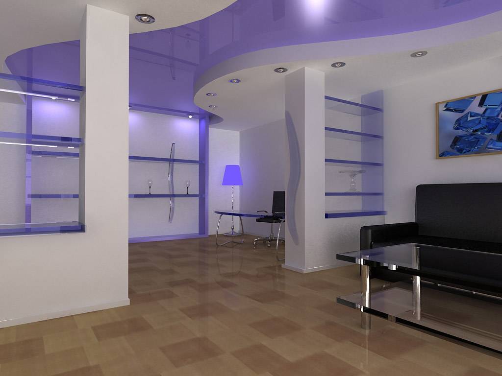 - помещению можно придать больше официоза при помощи синего, коричневого, черного или белого потолка.