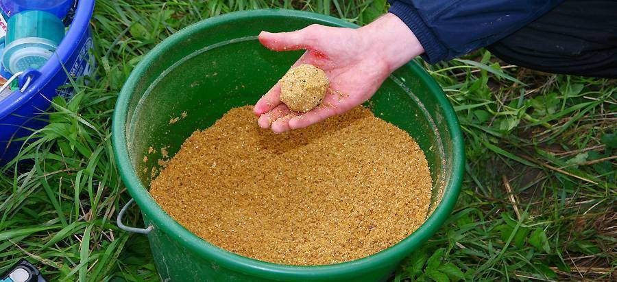 Ингредиенты размалываются и перемешиваются. Не помешает прихватить на ужение немного сухой молотой глины. При ловле на сильных течениях ее примешивают к прикормочному составу. Прикормку пропитывают водой из водоема.