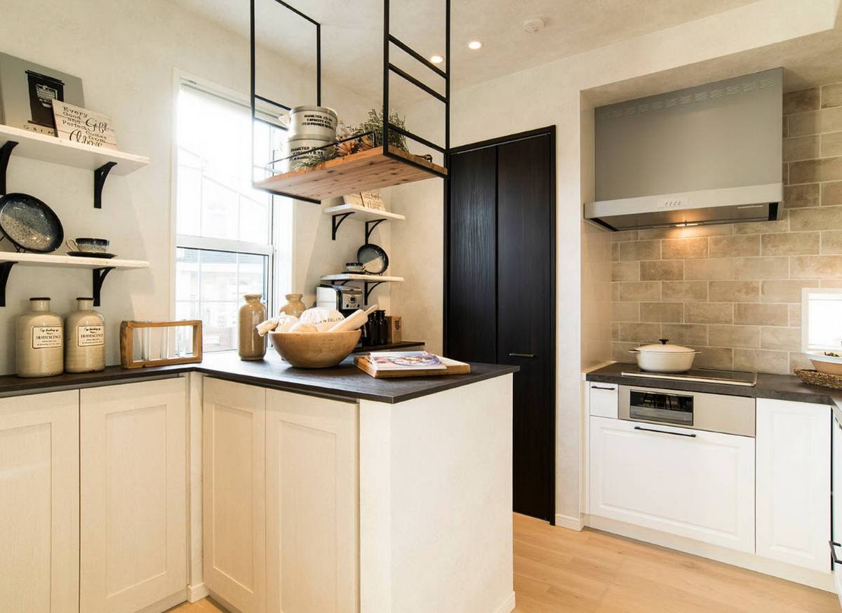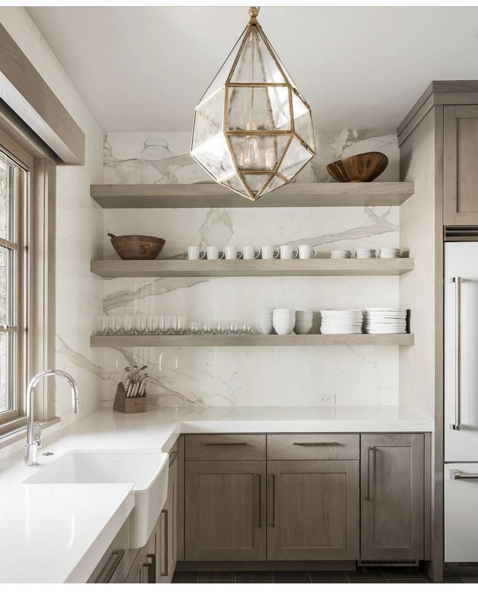 Верхние шкафчики можно организовать в виде открытых стеллажей. Это поможет более эффективно разместить все необходимое и при этом даст новые возможности в оформлении кухни. Декоративные элементы отлично смотрятся на открытых полках кухонного шкафа.