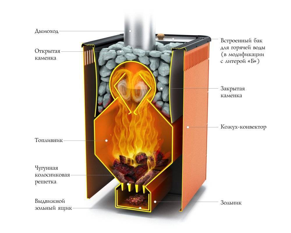 Металлические каменки всего 1,5–2 часа нагревают баню. Они довольно компактны, поэтому идеально подходят для небольших помещений. Каменки обычно открытого типа. Камни греются за счет камеры сгорания. В металлической печи можно сжигать разные виды топлива в зависимости от модели.