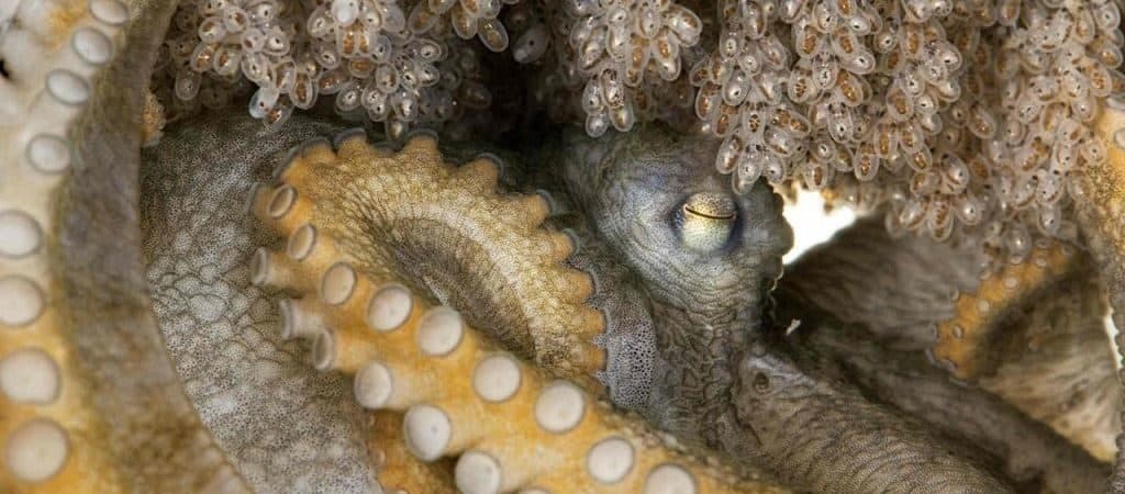 - Одна из самых любящих и заботливых матерей в животном мире – самка осьминога. В течение шестинедельного инкубационного периода она не отходит от своих яиц. На момент вылупления детенышей, их мама уже находится при смерти или умирает. Малыши кушают ее плоть и начинают свой наполненный опасностями жизненный путь.