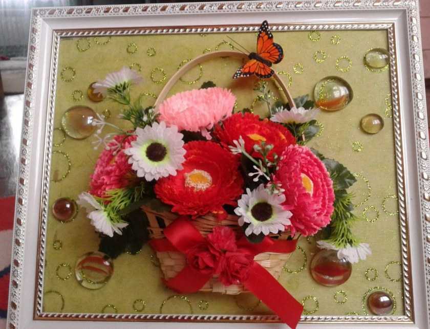 - Выкладываем цветы в любом порядке, в зависимости от общей формы желаемого панно. Это может быть форма сердца, а можно выложить цветы и в форме дерева. Проявляем фантазию и воплощаем ее в жизнь!