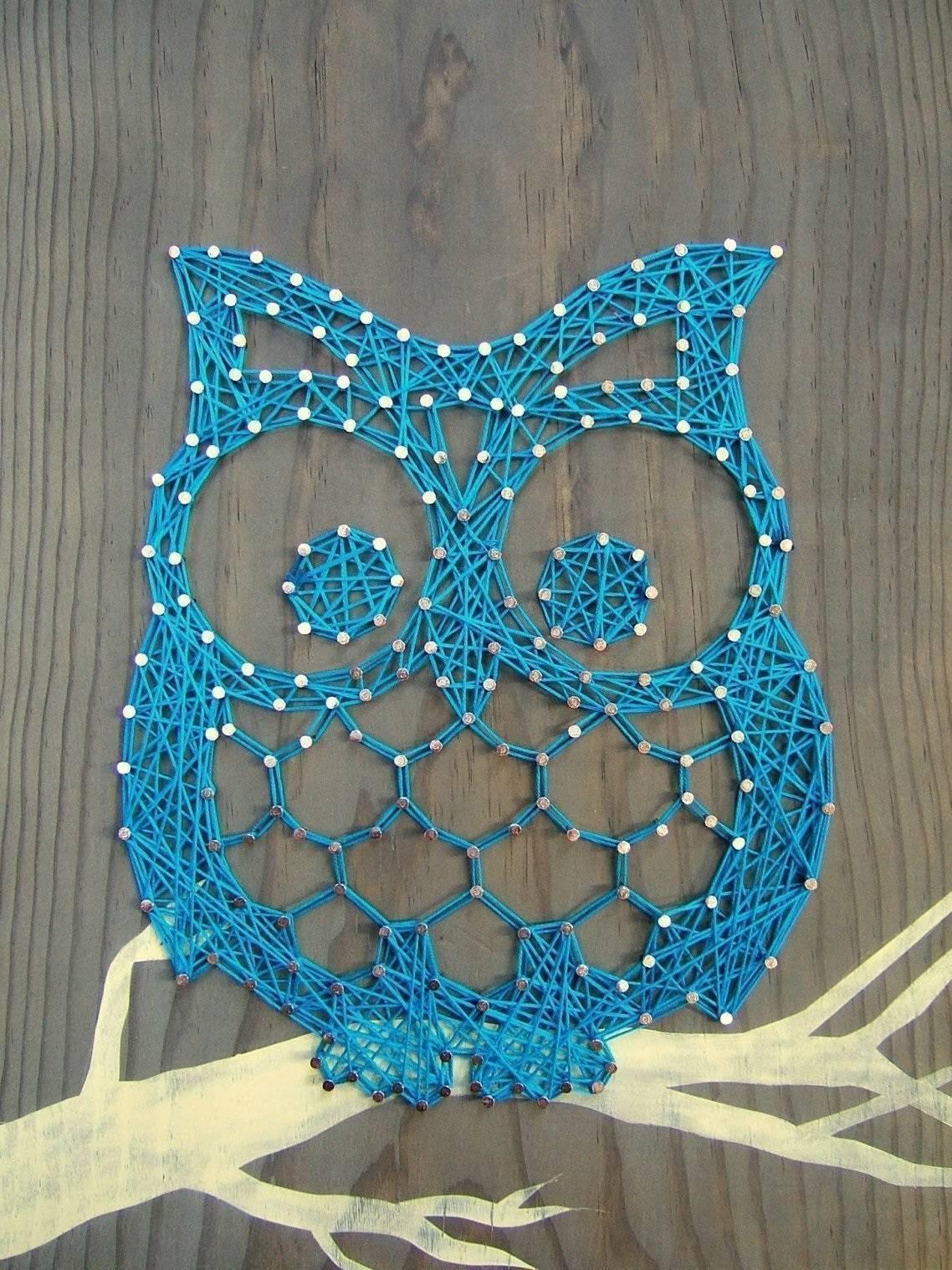 Для такой работы можно взять за основу лист фанеры нужного размера и простым карандашом наметить контуры будущих элементов. Затем по этому контуру на небольшом расстоянии забивают обычные гвозди таким образом, чтобы половина длины оставалась сверху. После все верхушки оплетают веревкой или бечевкой. Техника плетения может быть различной.
