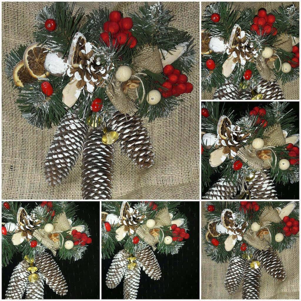 Для новогоднего панно используют еловые ветки, шишки, игрушки.