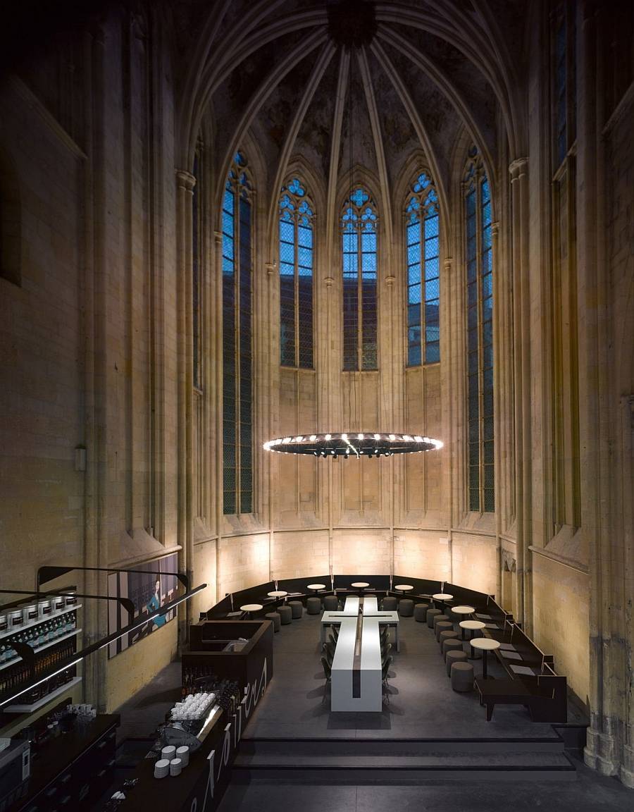 Высокие стены храма, очевидно, идеально подходят для 25 000 книг в новом магазине, а удивительные интерьеры могут вызвать трепет. Стол в форме креста в зале для чтения и удивительные светильники завершают интерьер.