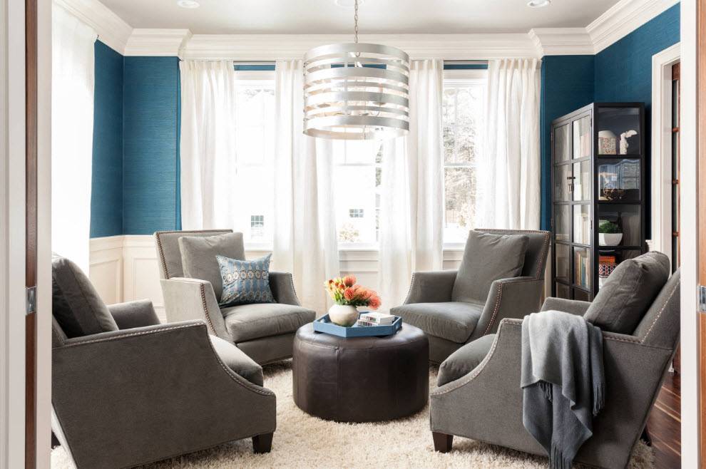 Создать спокойную умиротворенную атмосферу можно с помощью соответствующего цветового решения. Хороший пример мы видим на фото. Обои благородного синего оттенка не выглядят уныло и безлико. Дополняющие белые элементы придают живости интерьеру, делают гостиную изысканной и лаконичной. Здесь очень приятно проводить время в семейном кругу или с близкими друзьями, наслаждаться душевными беседами или просто отдыхать, с головой погрузившись в историю любимой книги.
