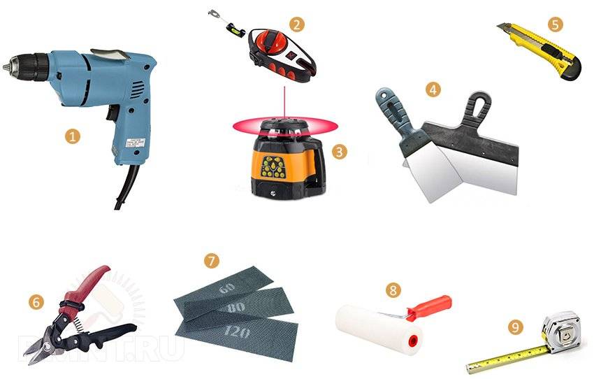Для монтажа лучше сразу позаботиться о наличии необходимых материалов и инструментов. Потребуются саморезы по дереву и по металлу – количество зависит от площади стен и вида каркаса. Для резки и разметки нужны рулетка, уровень, маркер, длинная линейка и малярный нож. Деревянные направляющие потребуют ножовки по дереву, а металлические профили ножниц по металлу или болгарки. Для крепления к стенам и профилям нужны дрель и шуруповерт.