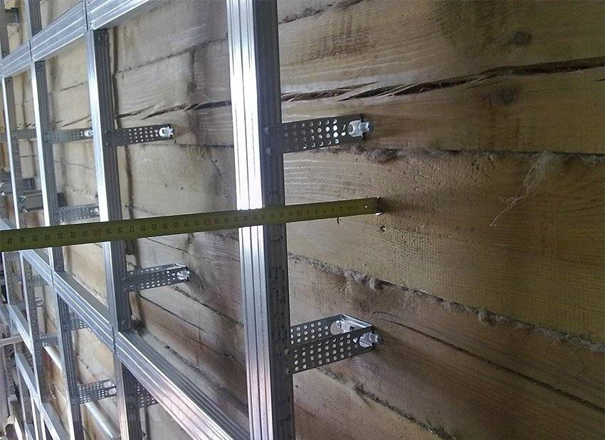 Данный способ пространства и денег «съест» больше, но по надежности превзойдет предыдущий вариант. Кроме непосредственно ГВЛ и бруса для обрешетки понадобятся оцинкованный профиль, предназначенный для монтажа гипсокартонной обшивки. Брус приобрести можно одного размера, потому что у сооружаемой из него деревянной обрешетки несколько иная функция. Предварительный деревянный каркас согласно этой схеме жестко крепится к срубу. А вот металлическая каркасная система будет прикреплена к предварительной деревянной обрешетке на скользящий крепеж, позволяющий двигаться стене.
