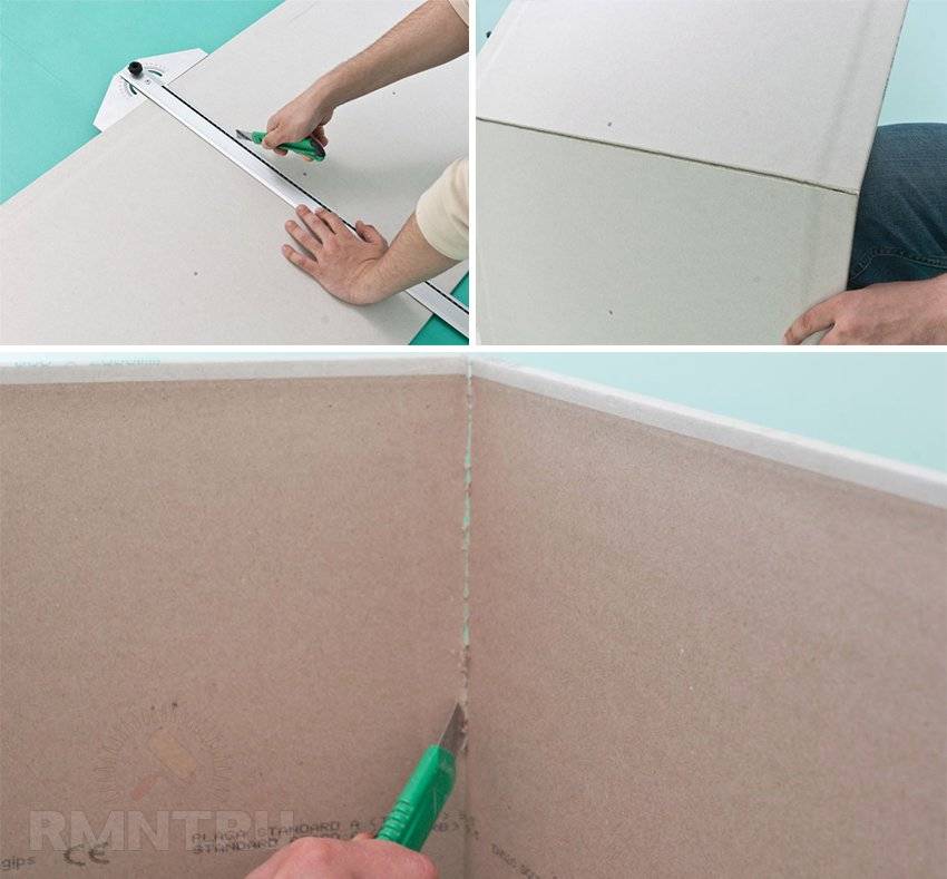 - Затем панель сломайте по месту надреза под углом (чтобы гипс-сердечник лопнул) и прорежьте оборотную картонную сторону.