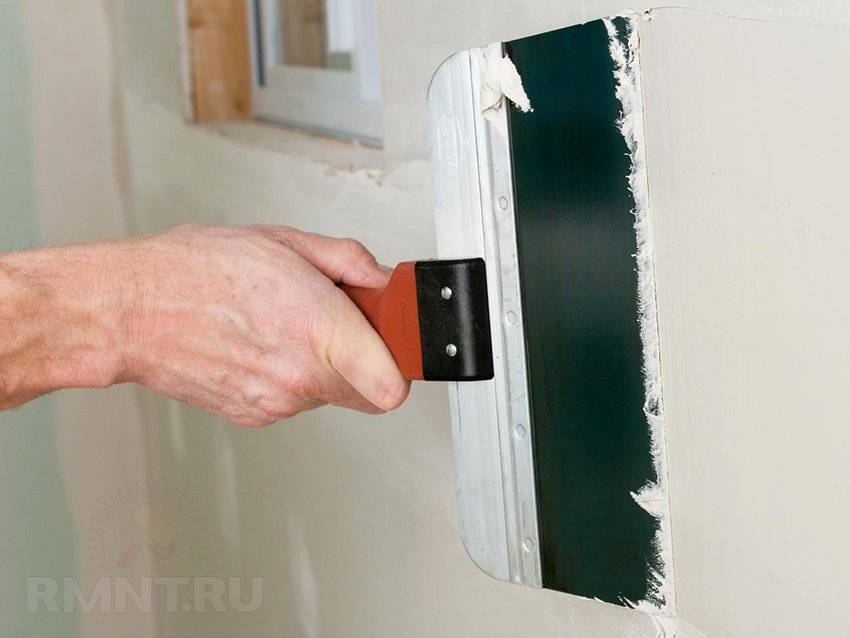 Перед нанесением шпаклёвки стену следует очистить от монтажной пыли и прогрунтовать. После высыхания грунтовки можно продолжать работы.