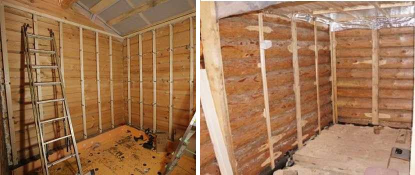 Смонтированный деревянный каркас под гипсокартон в доме из бруса