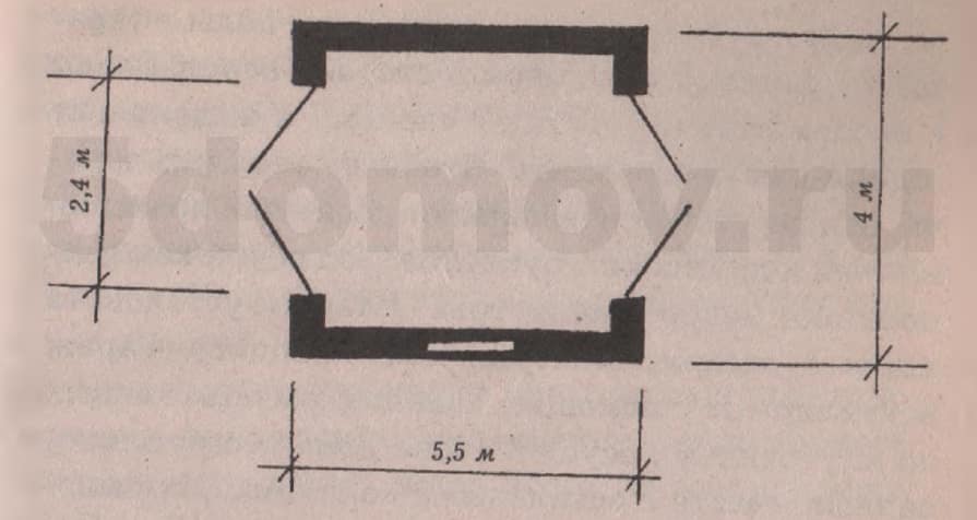 Наиболее распространены гаражи, имеющие наружные размеры 5,5 х 4 (3,85) м. Гараж оборудуют воротами, которые могут быть сквозными ({рис. 1) или иметь одну пару, смещенную для удобства вывода машины к одной из стен (рис. 2).