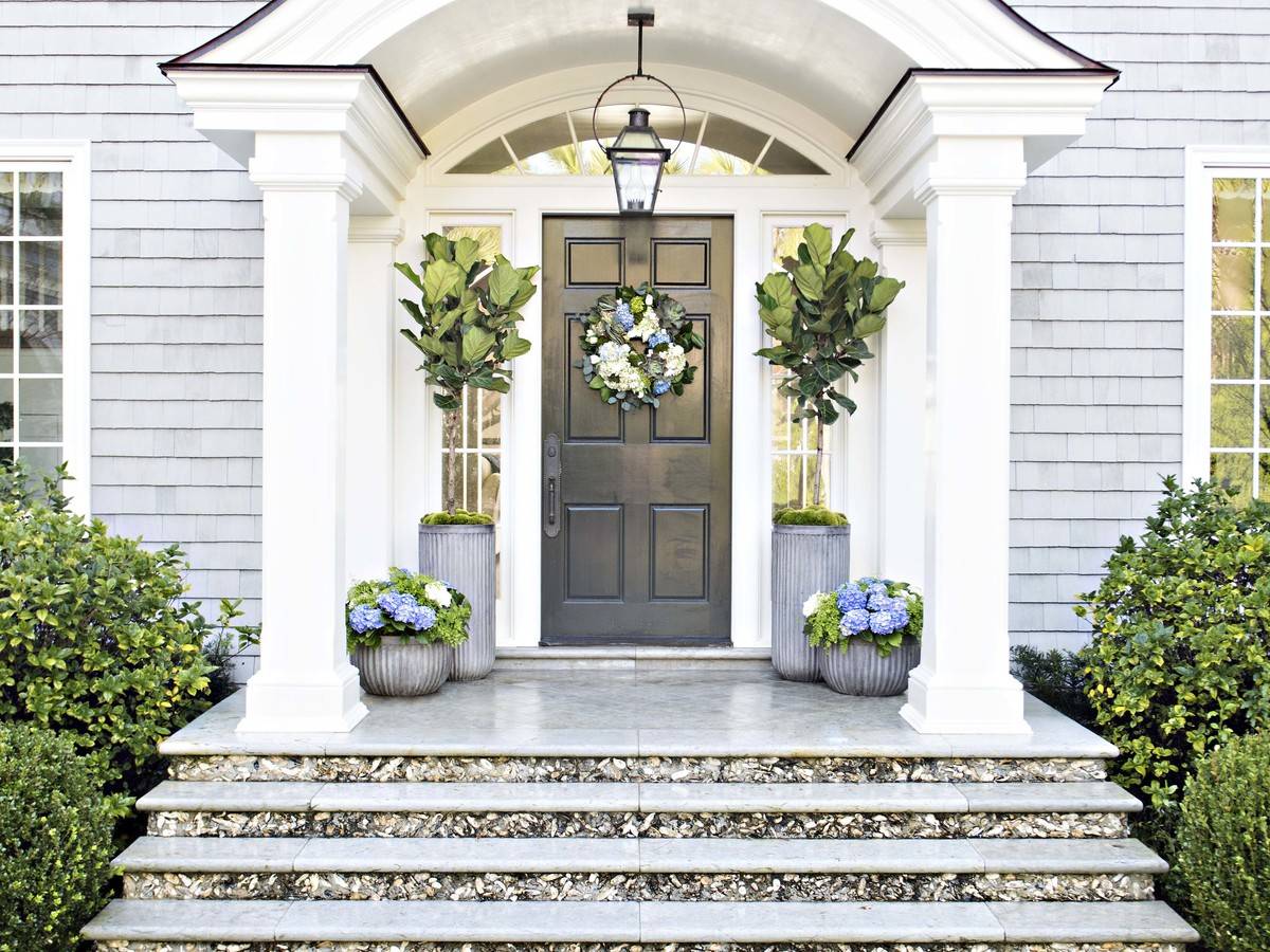 Дизайн входа в дом может напоминать греческий – античный, с классическими линиями. Второй способ придать фасаду уют – испано-итальянская тематика. В греческом декоре много каменных элементов, колонн. Для второго типа характерна открытая украшенная терраса с настилом из палубных досок. По периметру веранды устанавливают каменные балясины, а в центре двора – фонтан или скульптура.