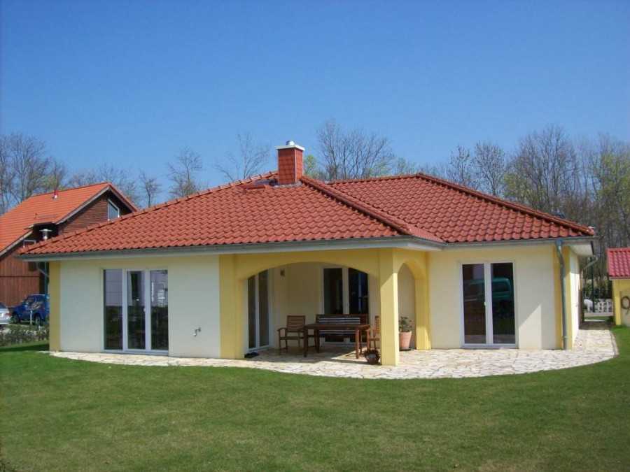 Общая площадь 100 кв. м. Кухня с аркой и объединенная гостиная-столовая занимают треть всего пространства. Широкая стеклянная раздвижная дверь на террасу является изюминкой этого дома. Летом обедать можно на свежем воздухе. Рядом с кухней есть котельная. Ванная комната небольшая, но в ней вмещается вся необходимая сантехника. Прихожая и холл разделены дверью. Все спальни находятся рядом друг с другом, что удобно для родителей и детей.