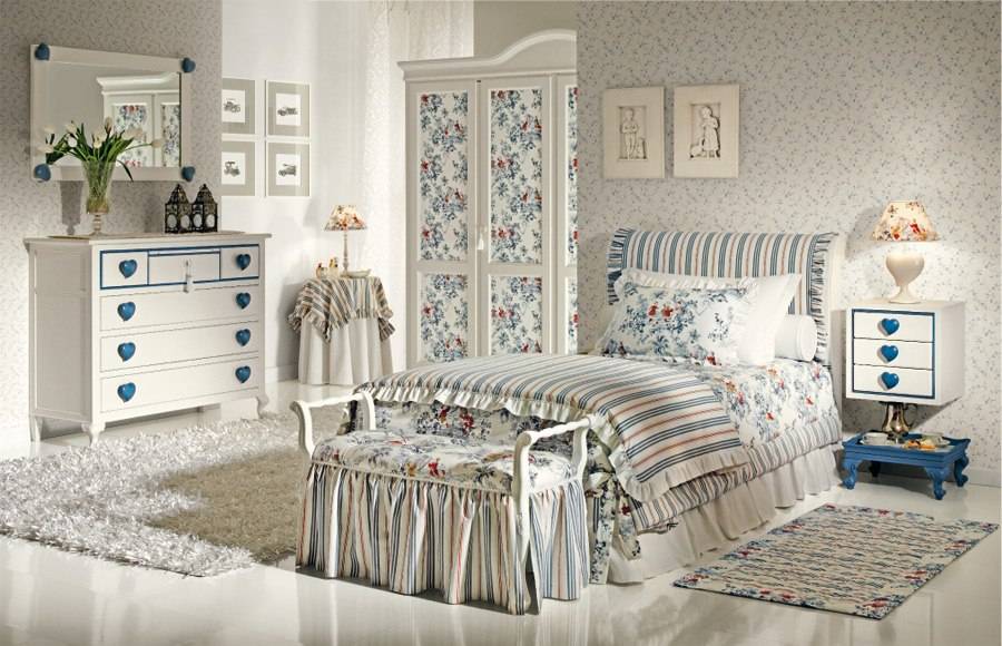 Деревенская простота в сочетании с особым изяществом характеризуют этот стиль. Можно создать уютную девичью комнату, причем без больших вложений. Декор достаточно прост — светлые стены с рисунком из мелких цветов и белый потолок.