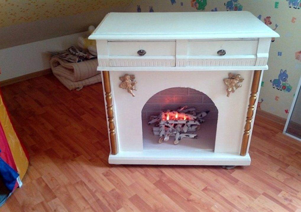 Старая тумбочка, остатки бабушкиной этажерки, обретут новую жизнь, став современнейшим камином. Из предмета вынимают лишние полочки, верх оформляют доской, стенки внутри и снаружи шлифуют, шпаклюют, окрашивают краской либо облицовывают камнем, пенопластовой лепниной.