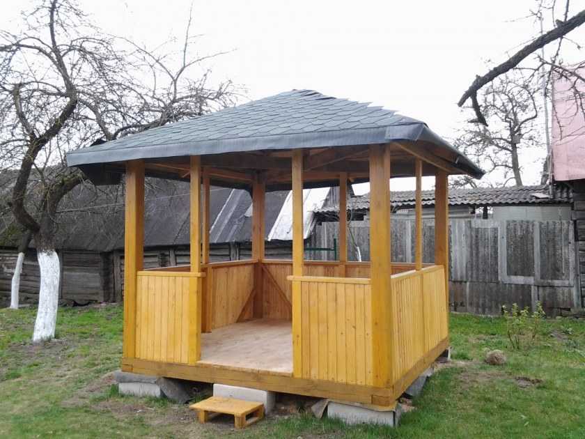 Это тип исключительно летних беседок. Крыша, пол… и возможность посидеть, отдохнуть, глядя на свой дачный участок. Здесь можно устроить летнюю столовую, где будет собираться вся семья, чтобы вести незабываемые душевные разговоры за чашечкой чая.