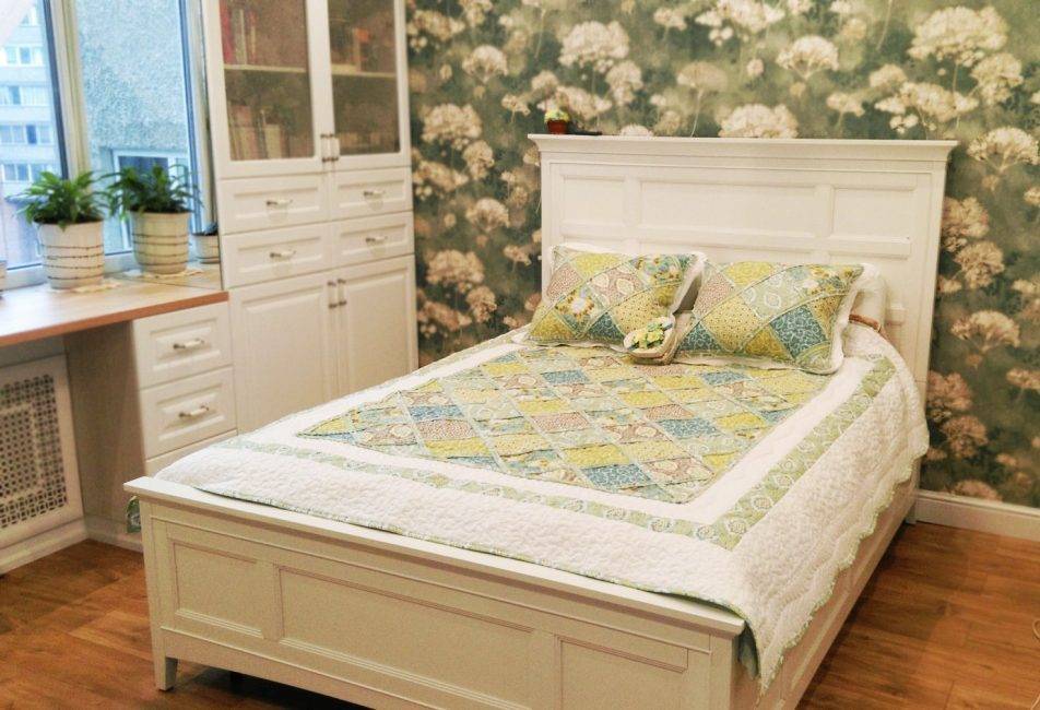 Создать в спальне атмосферу французского стиля прованс получится при помощи обоев в мелкий цветочек. Романтичную нотку зададут изделия светлой и нежной расцветки. Подбирать шторы и покрывало следует так, чтобы узоры на них сочетались. Красиво на постели выглядят цветочные мотивы.