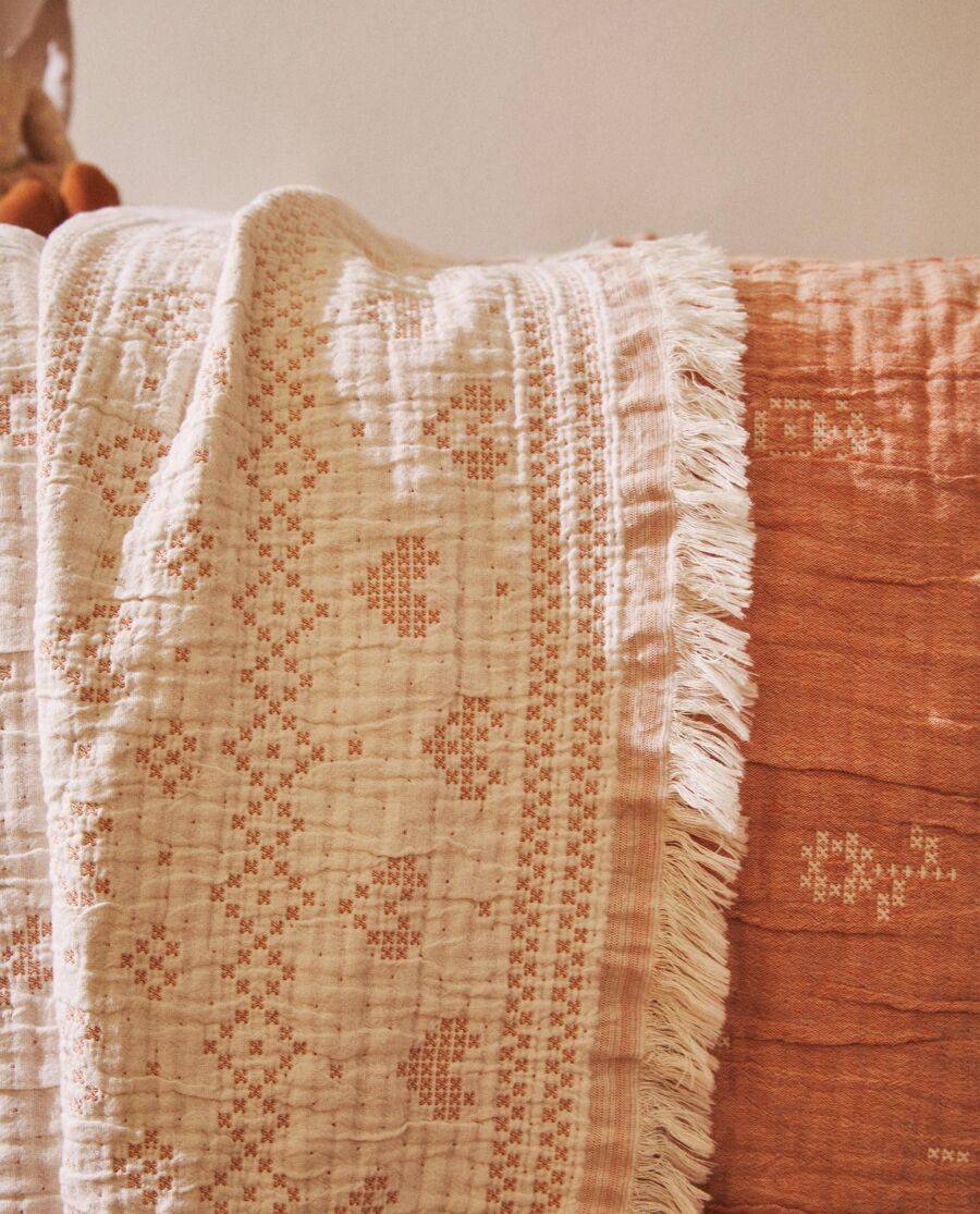 Добиться стилизации под этнические мотивы удастся, если приобрести текстиль с подходящими узорами. Орнаменты, нанесенные на ткань, могут быть выполнены в китайском, индийском или японском направлении. Цвет для покрывала выбирается совершенно разный (это могут быть как кричащие, так и спокойные тона). С помощью удачно подобранного пледа удастся сделать яркий акцент в комнате.