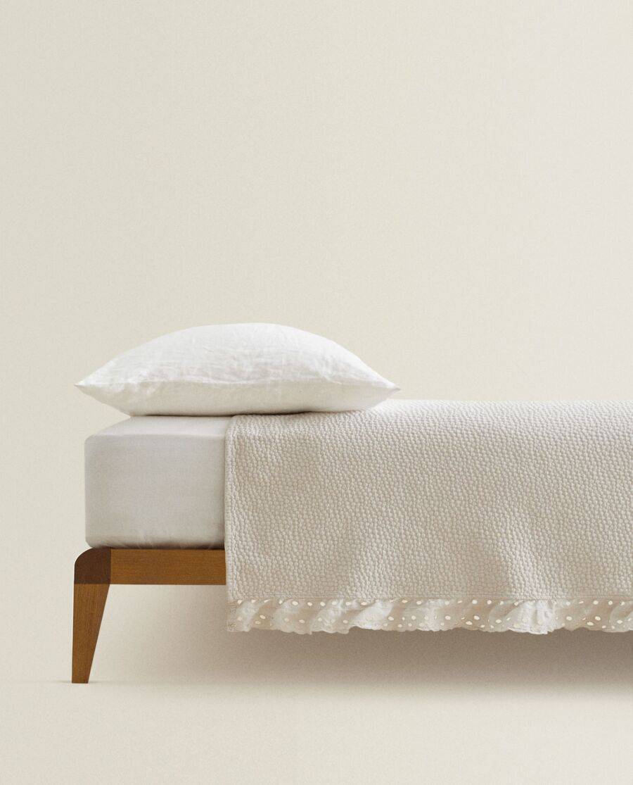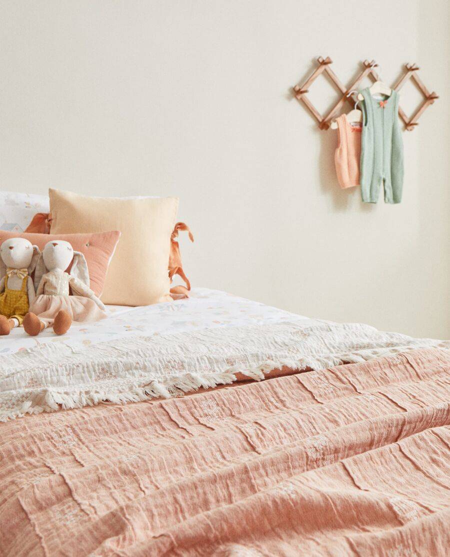 Покрывало, декорированное оборками, выглядит очень мило, нежно и симпатично и наполняет обстановку легкостью и кокетством.