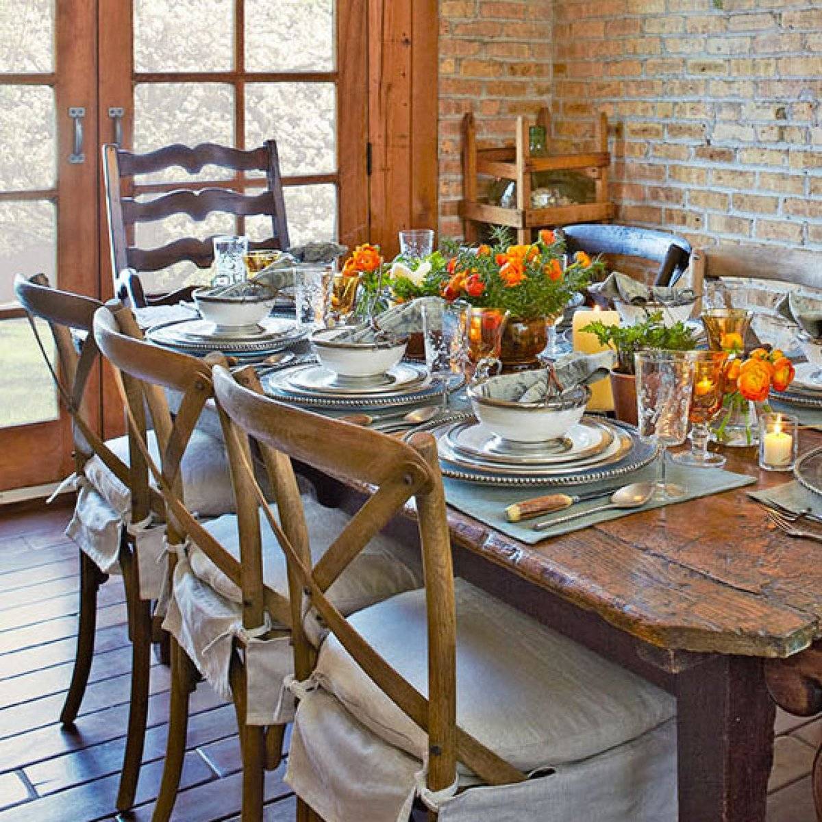 - Рустикальный стиль (обилие предметов с природной текстурой). Непокрытый стол из натурального дерева. Посуда в деревенском стиле, стаканы вместо бокалов.