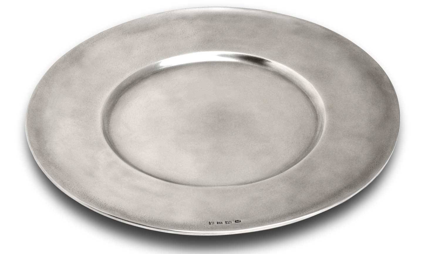 - Сервировочная. Абсолютно плоская, диаметр не меньше 30 см. Именно с нее начинают оформление стола. На сервировочную тарелку ставят посуду для всех остальных блюд. Иногда она визуально отличается от остального сервиза, например, выполнена из дорогого фарфора или серебра. Остается на столе до подачи десерта.