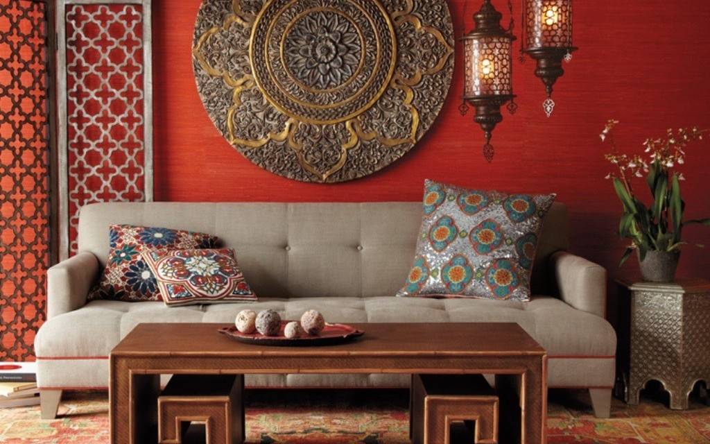Восточный интерьер полон ярких и насыщенных оттенков, здесь нет бледного и невыразительного цвета. Это насыщенные сочетания тёплых тонов: красный, оранжевый и жёлтый, персиковый и малиновый, коралловый и темно-бордовый цвет. Акцент создаётся фиолетовым, зелёным, синим, бирюзовым или изумрудным цветом.