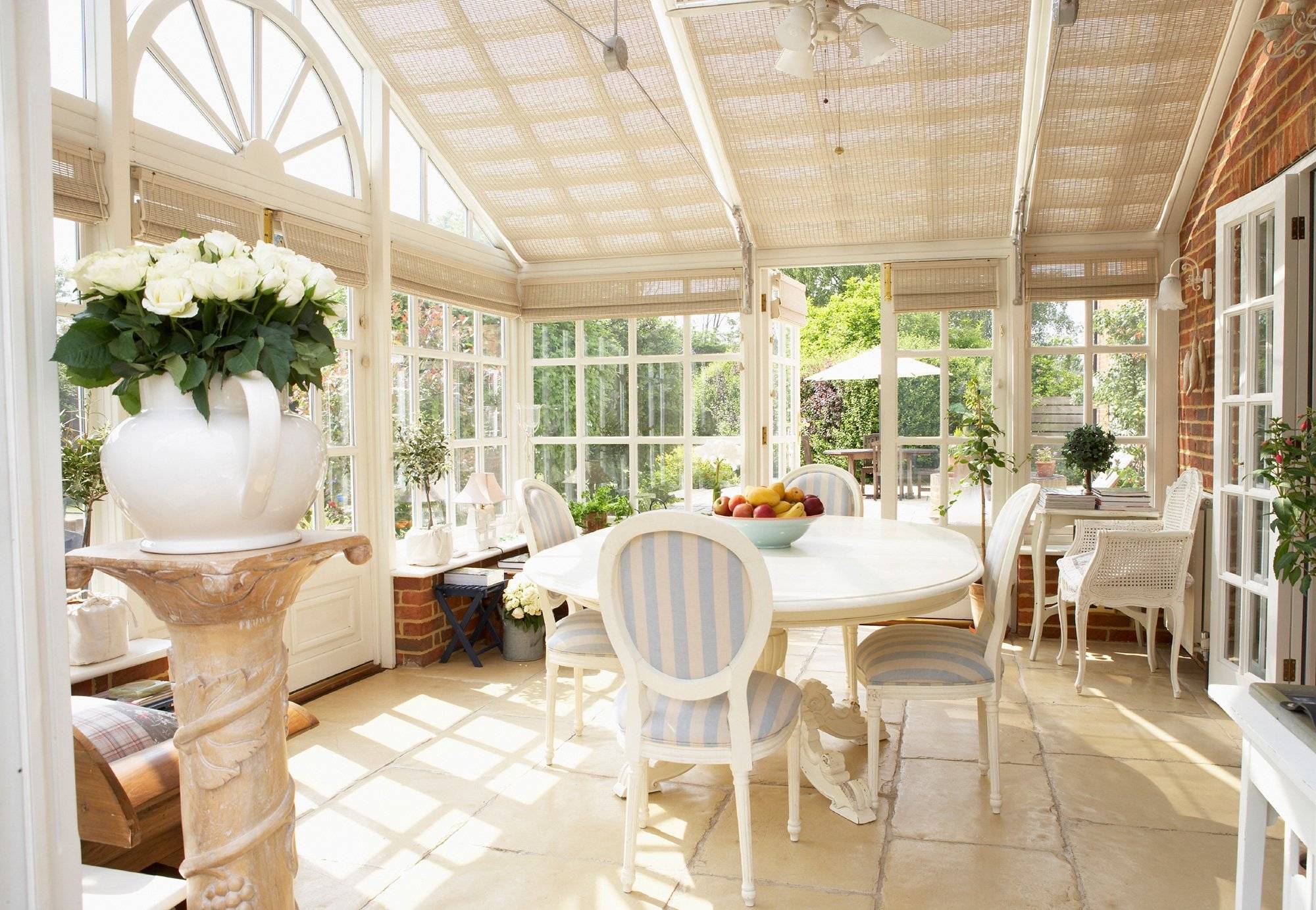 Существует несколько способов оформления веранды. Главным критерием в таком помещении загородного дома является наличие большого количества света. Но бывают моменты, когда избыток солнечных лучей не уместен. Для этого используют элементы способные уменьшить освещённость данного помещения: