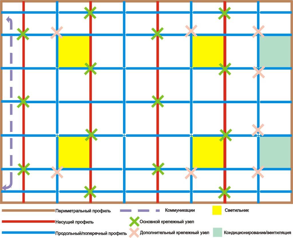 Перед монтажом сетчатого покрытия разрабатывается схема, где указываются габариты ячеек, места прокладки инженерных коммуникаций и шаг установки профилей. Далее базовая потолочная поверхность размечается. На стенах чертят границу, на которой будет находиться решетчатое покрытие.