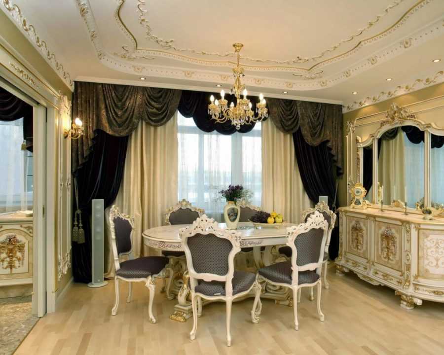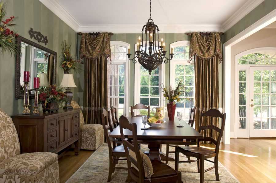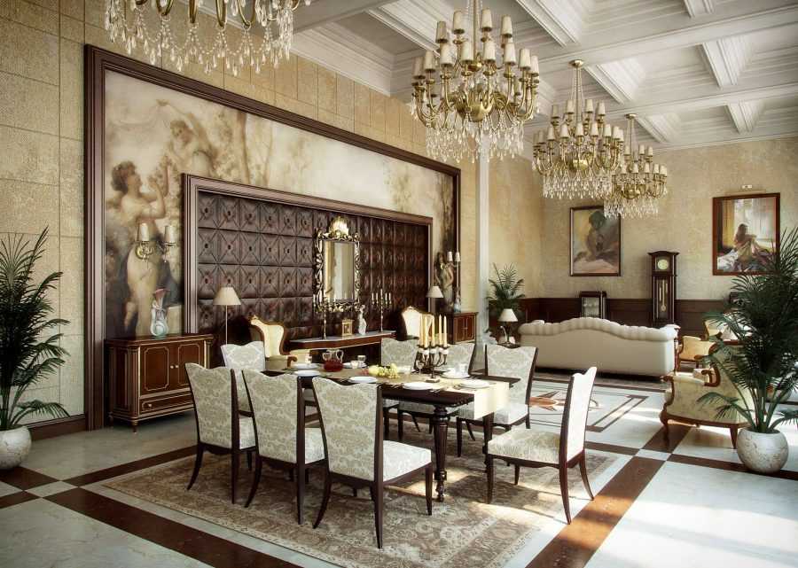 Классический дизайн интерьера этого помещения подразумевает обязательное наличие стола, а также длинных лавок или кресел, расставленных по кругу.