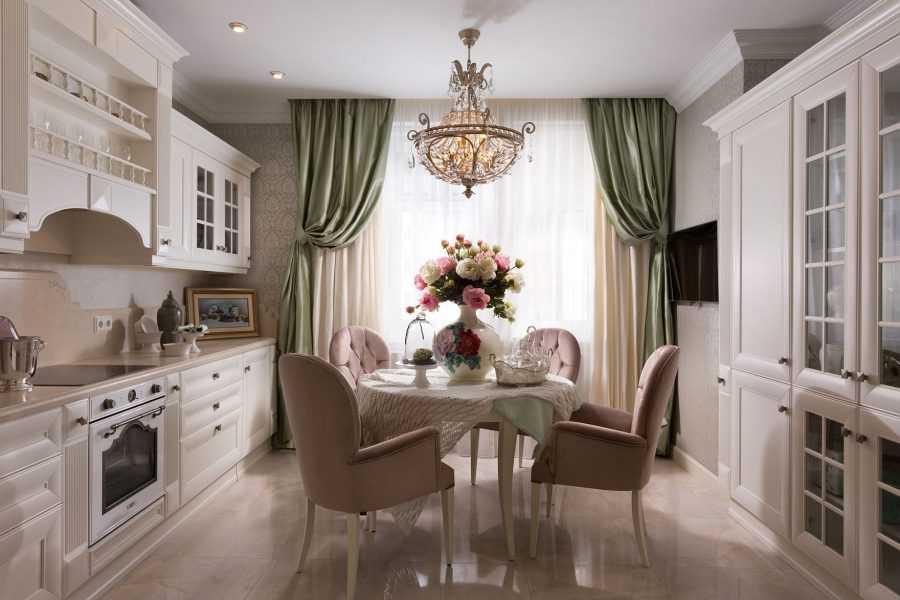 Интерьер кухни в классическом стиле сочетает в себе встраиваемый типы конструкций кухонного гарнитура. Бытовая техника должна быть выполнена в общей цветовой гамме. Её дизайн может содержать необычную фурнитуру, дизайн которой состоит из плавных линий.
