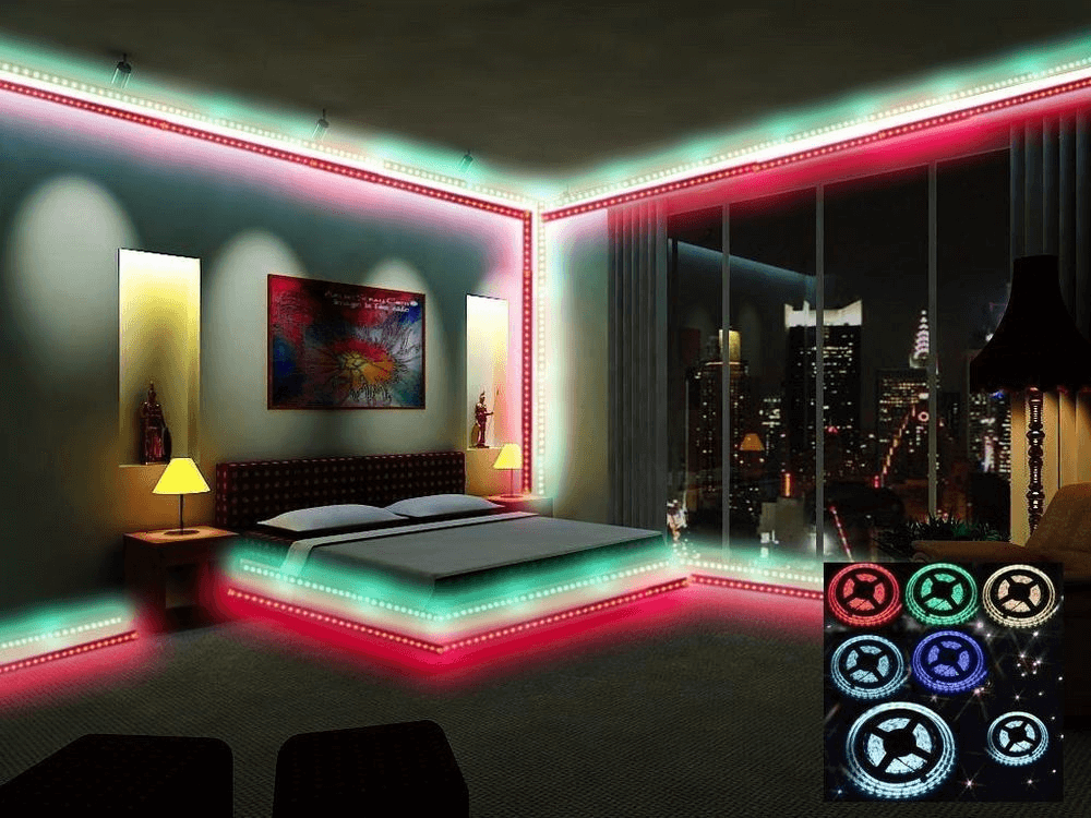 Для подсветки обычно применяется светодиодная лента. Её цена невысока, а монтаж не занимает времени и сил. Если в спальне есть телевизор, стоит использовать ленту за его корпусом, чтобы глаза не напрягались во время просмотра фильма.