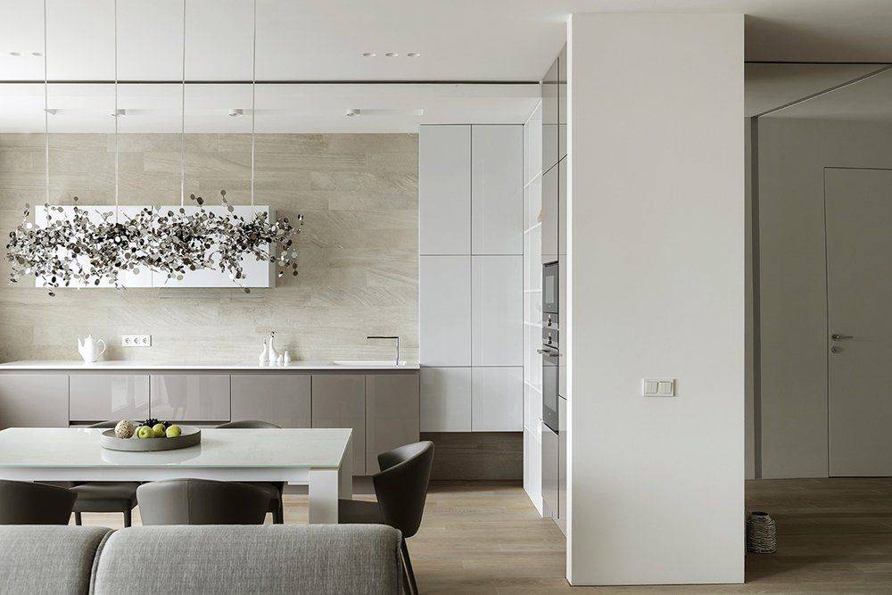 Эргономичная белая кухня с зелёными акцентами и прекрасным освещением