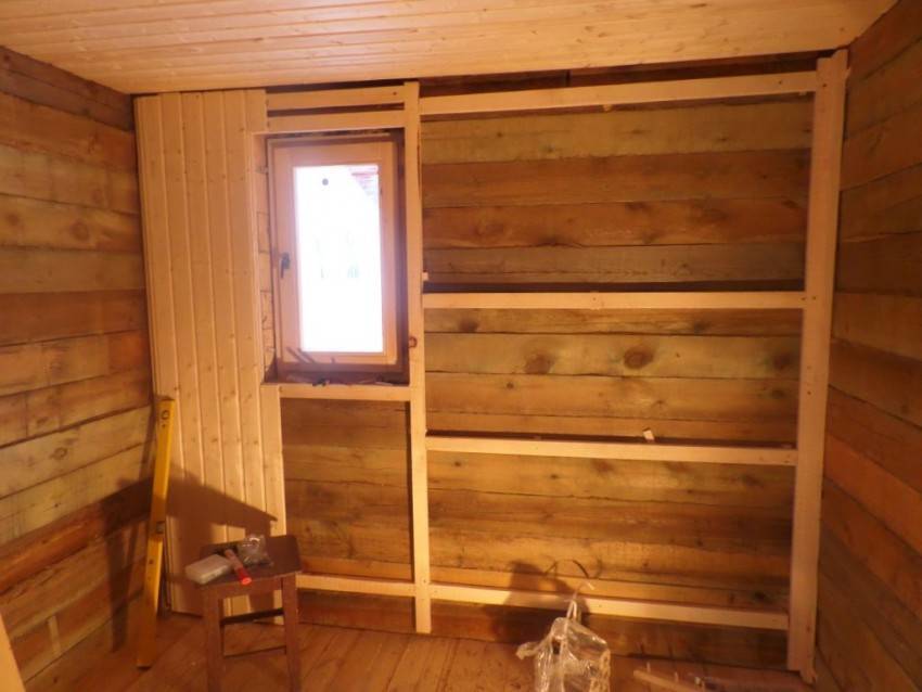 - На потолке, стенах делаем обрешетку из деревянных реек средней толщины 5‒10 см (точная цифра зависит от толщины утеплителя).