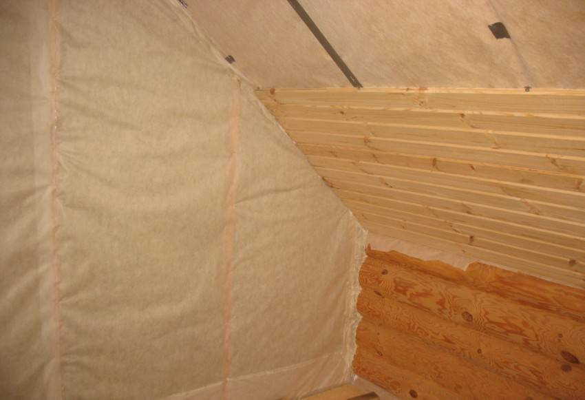 Потолок бани тоже можно теплоизолировать. Для обрешетки можно использовать брусок квадратного сечения со стороной 50 мм. Если поверхность неровная, можно под рейки уложить подкладки. Перекрытие следует теплоизолировать и защитить слоем гидроизоляции. Можно совместно с этим использовать пароизоляцию. В качестве последней довольно часто выступает мембранная пленка. Слой гидроизоляции прибивается рейками обрешетки.