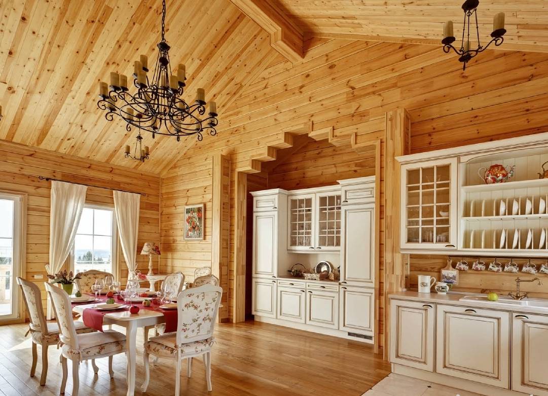 - В деревянных жилищах из брёвен впишется кухня в стиле прованс, эко или «Русская дача». Здесь можно делать акцент на русскую культуру, декорировать помещение небрежными и необработанными элементами.