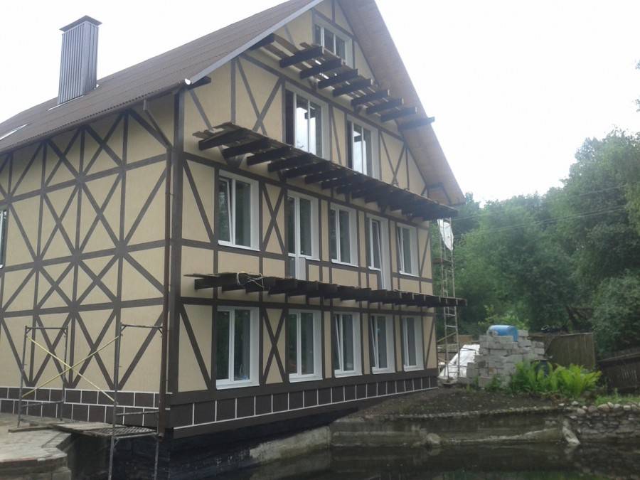 Мокрый фасад, технология которого довольно проста, позволяет применять любую финишную отделку. Детализировать отделку можно красивыми деревянными балками, которые монтируют поверх штукатурки. Получается очень уютный и стильный внешний облик по типу фахверк.