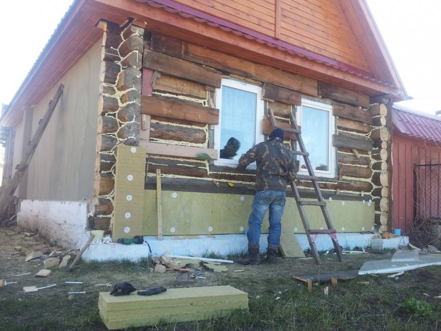 - Сначала монтируется утеплитель на стены на клей и фасадные дюбеля.