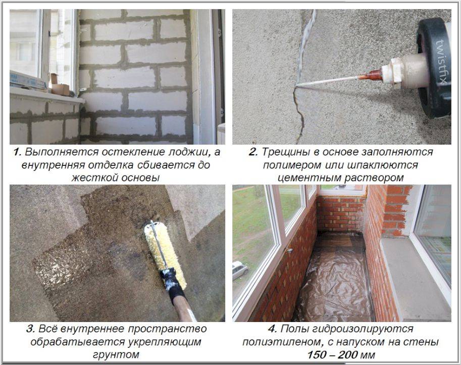 Если несущая стена лоджии или балкона облицована плиткой и отделка держится прочно, то сбивать ее не обязательно, удаляются только старые материалы с признаками отслоения