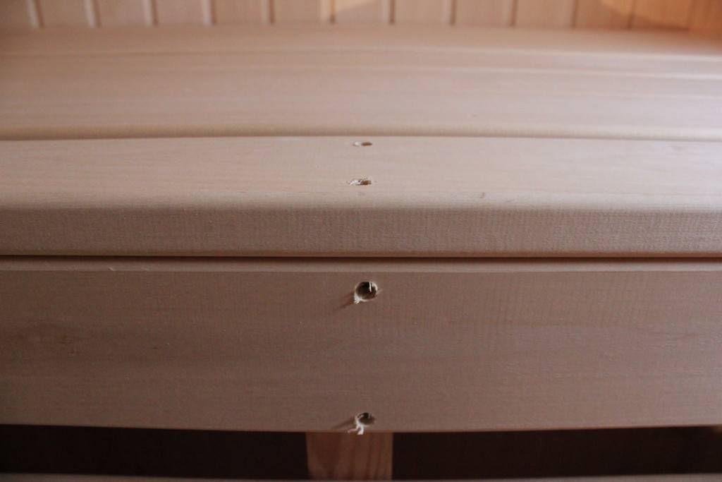 Перед монтажом досок для полков в местах крепления их рассверливают на 5 мм. Диаметр отверстия должен быть равен диаметру шляпки самореза которым крепятся полки, чтобы он немного утапливался внутрь доски. Саморез сверху закрывают деревянной заглушкой, вбивая ее в рассверленное отверстие и отпиливая заподлицо с полком.