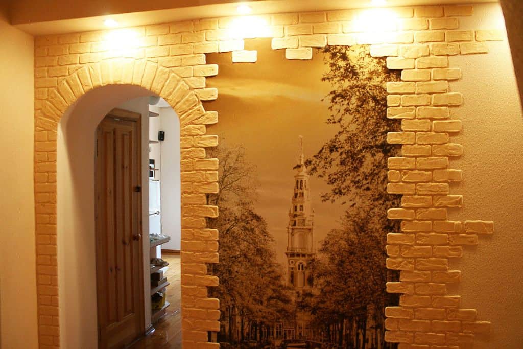 Гармоничное сочетание камня в прихожей с фотообоями на городскую тематику. Если собираетесь оформлять арку, воспользуйтесь каменной текстурой для того, чтобы подчеркнуть ее благородный статус.