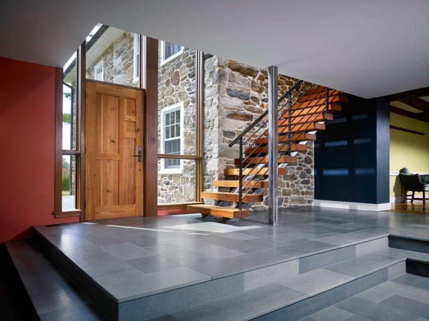 Светлая порода песчаника прекрасно работает на благо легкой и воздушной атмосферы в этой прихожей.