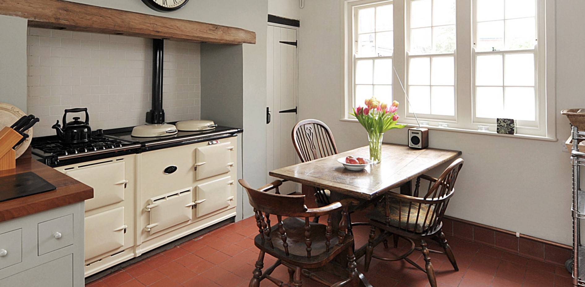 Каменный фартук гармонирует с деревянной декоративной балкой