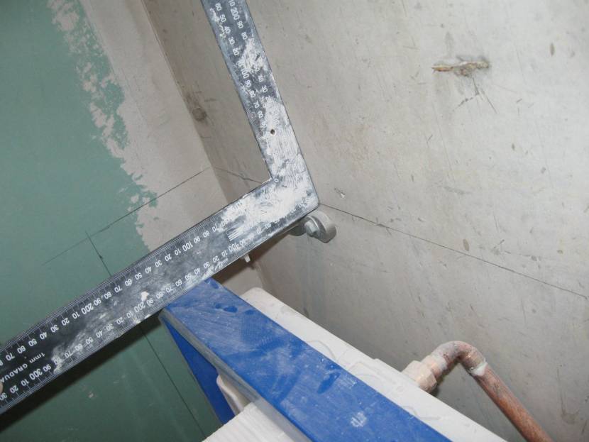 - В первую очередь выставляются боковые стойки. Для этого по углам туалета строго по отвесу крепятся четыре рейки. Они не должны касаться потолка и пола.